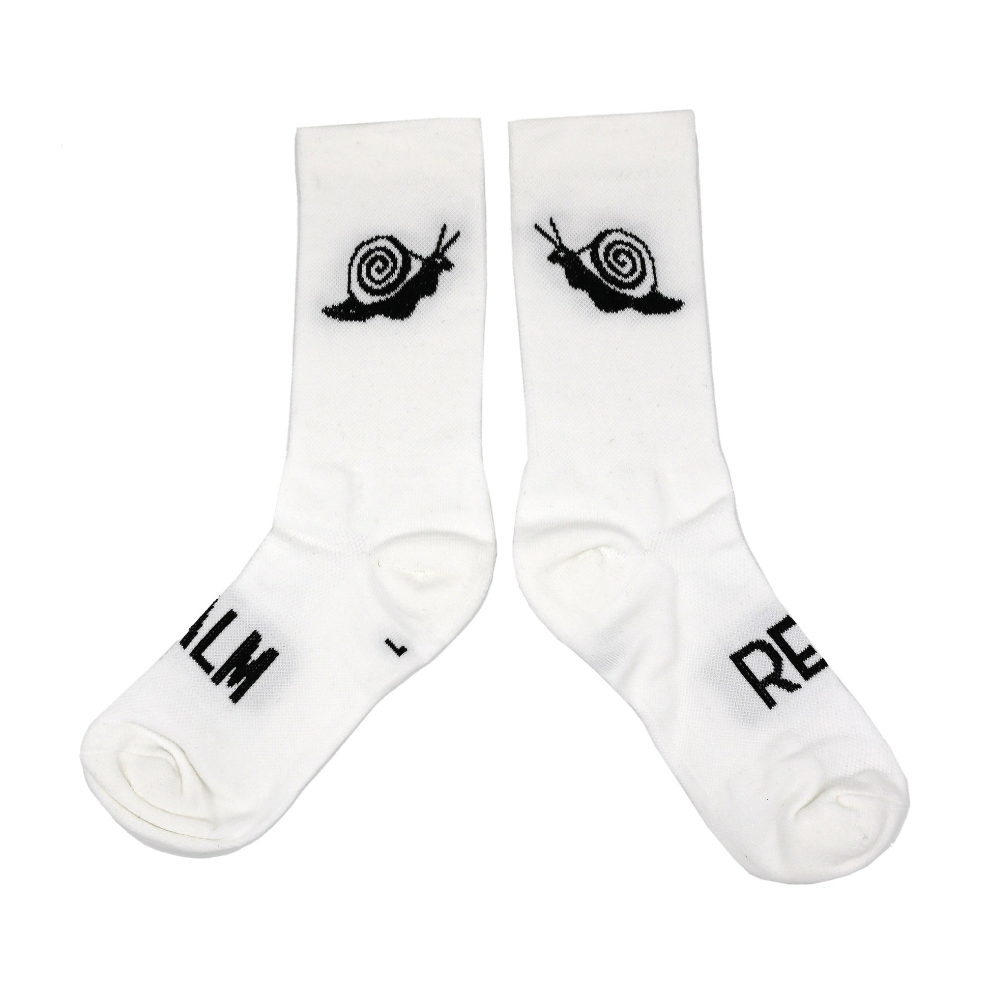 Finally! A sock made custom for us. I wanted to make something that would take the dyes beautifully, have something for the athletes and fashionistas alike. Made out of cotton to lessen the plastic footprint of most cycling socks, I think you're going to like this one. Now in un-dyed white! Woven Spiral Snail on both sides of each sock with our logo emblazoned across the top of the foot.